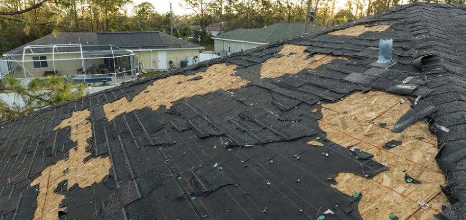 Ruined rooftop in need of repair. wind damaged house roof with missing asphalt shingles after hurricane ian in florida